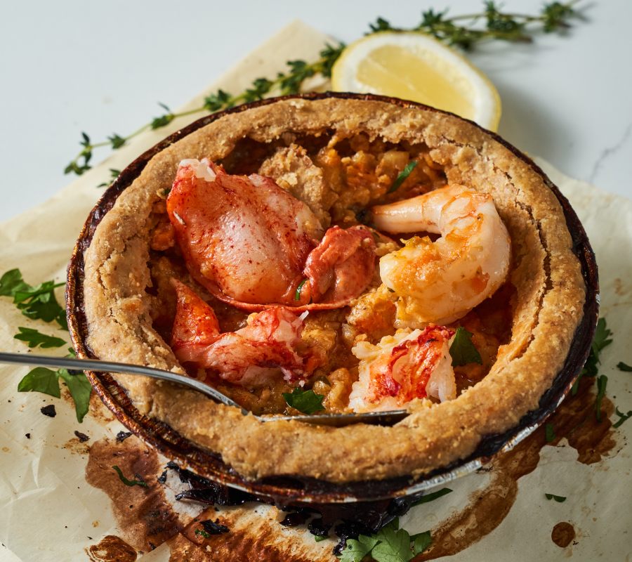 Our seafood potpies are the ultimate comfort-meets-coastal dish — buttery, flaky, and packed with bold flavor. Each 6″ pie is deep (2″ to be exact) and double-crusted, with a golden, hand-rolled top and bottom that holds up to rich, savory fillings. We use fresh, sustainably sourced seafood and seasonal vegetables, then build flavor with slow-simmered broths, aromatics, and herbs. Whether you’re into classic creamy chowder-style pies or something spiced with a little kick (think turmeric, coconut milk, or harissa), there’s a variety for everyone — and each one bakes up golden and bubbling in your own oven. Keep a few in your freezer and pull them out when you want a dinner that feels both easy and special. No shortcuts. Just real food, wrapped in flaky pastry.
